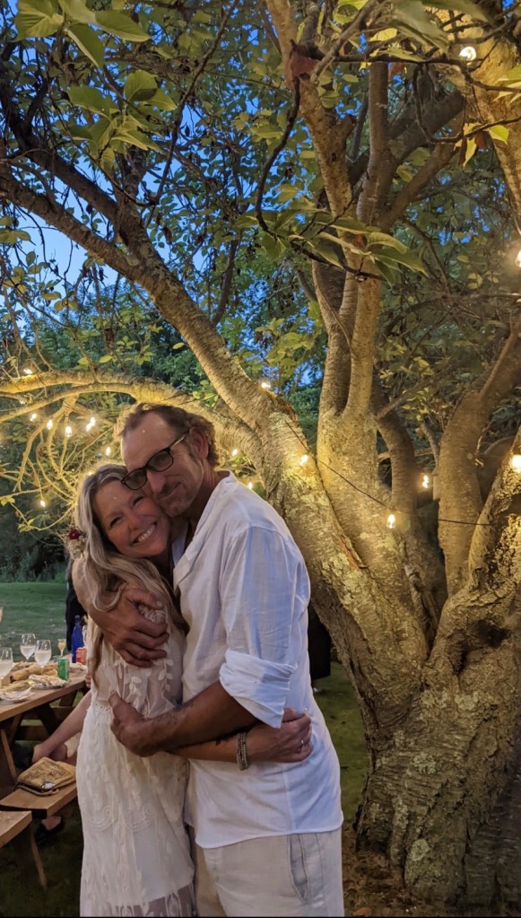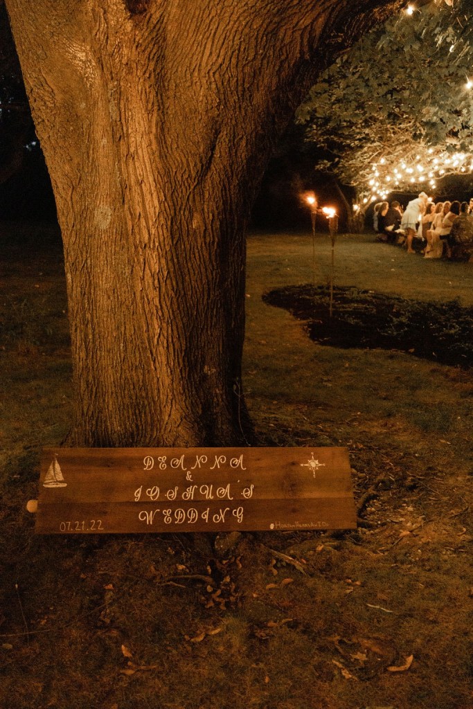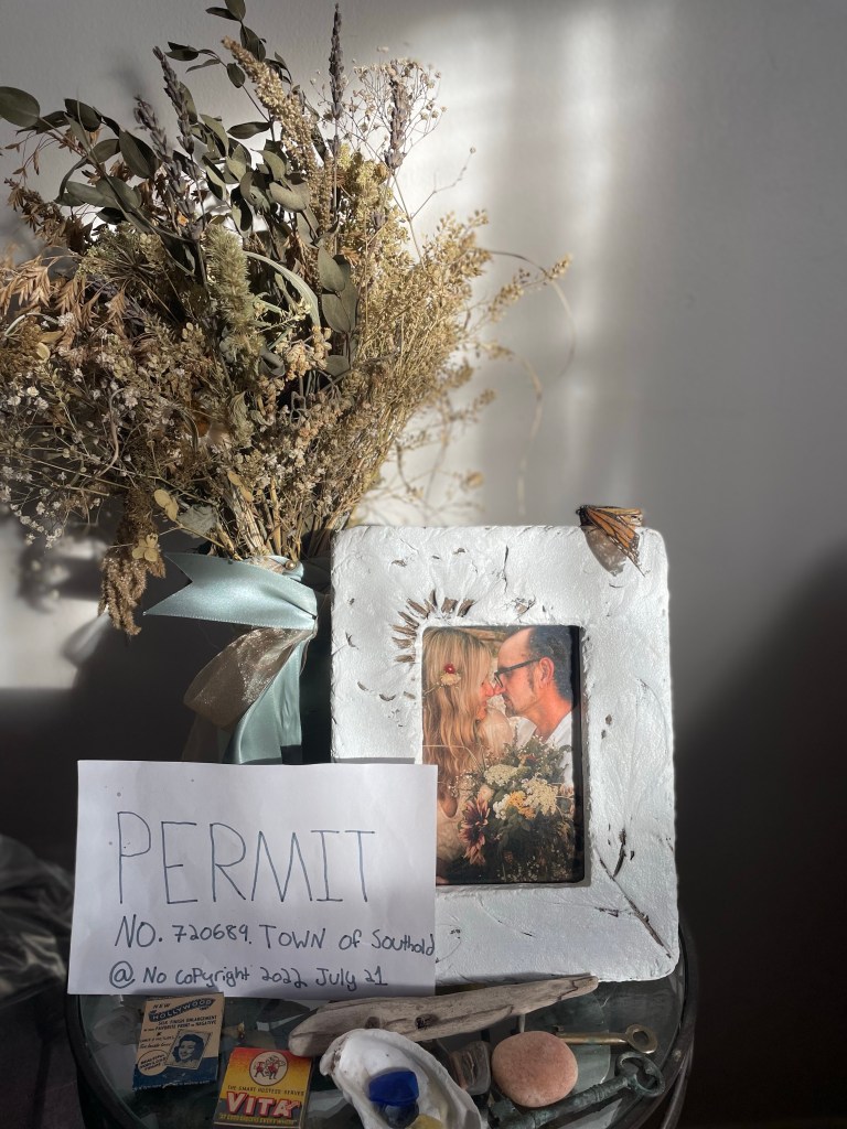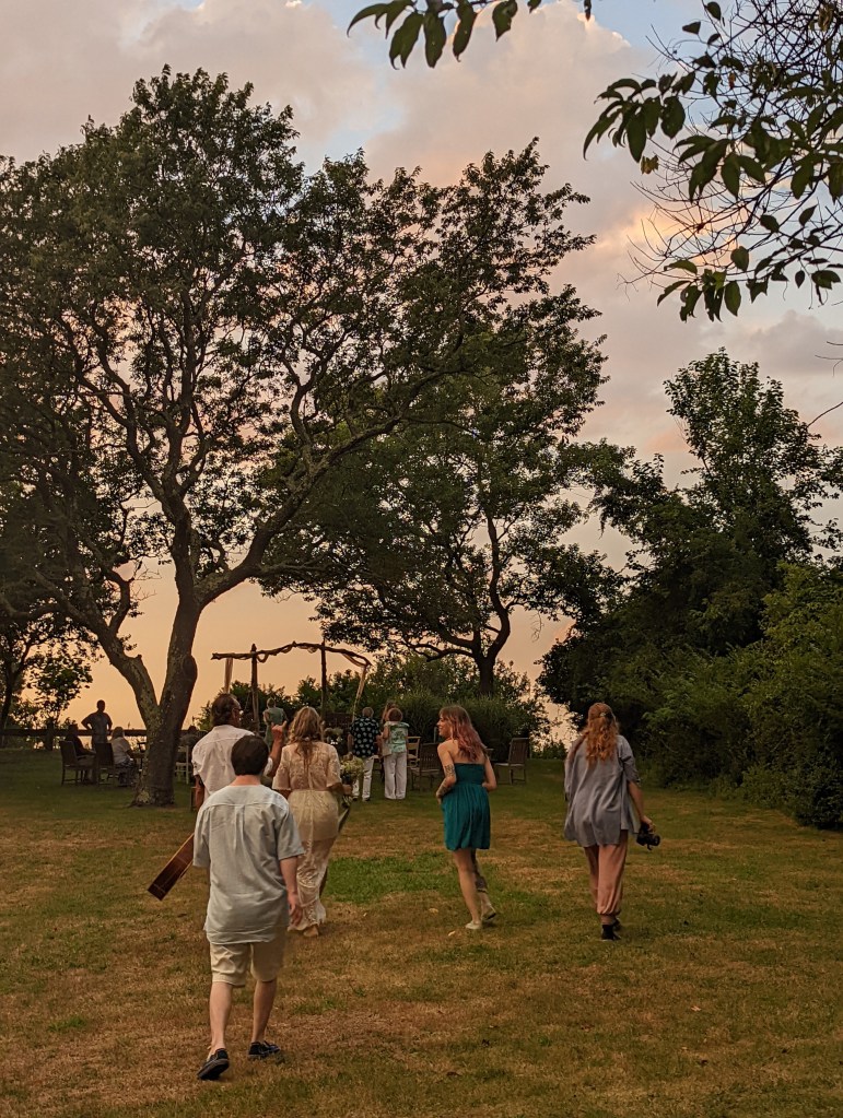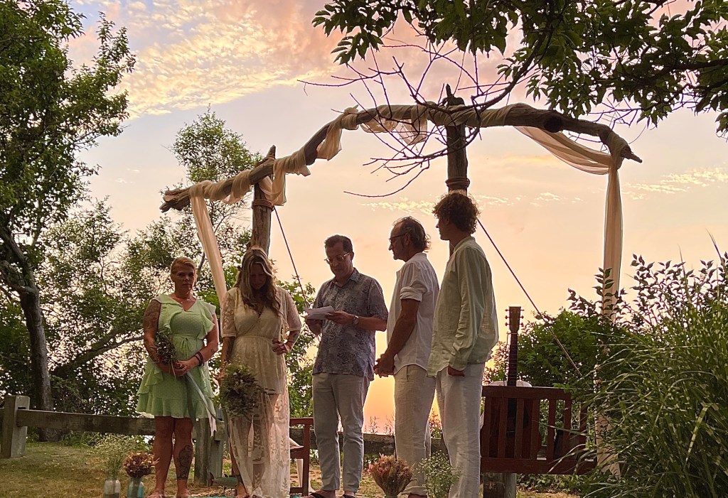 We picked a date. We changed the date. We asked the groom’s brother in law to please get ordained and officiate. We asked the groom’s sister to bake the cake. We asked them both to allow us to hold the reception in their backyard. There was driftwood dragged off the beach to create a wedding archway that was assembled and erected at the spot overlooking the water. The spot which neighbored the reception property. The spot which may technically be a public park. The spot which we may or may not have had a permit to use. Mismatched thrift store chair finds with some former funeral home chairs sprinkled in, created the intimate guest seating. I didn’t so much walk down the aisle, as frolic over to the spot after announcing in a loud voice to all gathered in the adjoining backyard to “follow me, I’m going to get married”. My oldest NoFo friend by my side. The groom’s son by his. As luck would have it, Mister Softee came by just in time to provide the processional music. The newly ordained officiant knocked it out of the park, especially when beginning the ceremony by quoting Prince. š The sunset sky was brilliant with a momentary threat in the form of a rumble of thunder and flash of light across the sky. Just the perfect amount of drama.