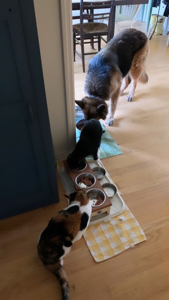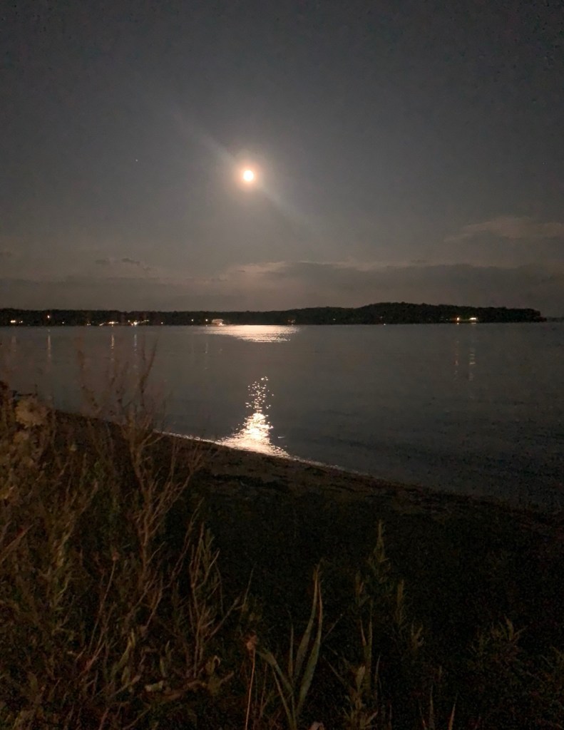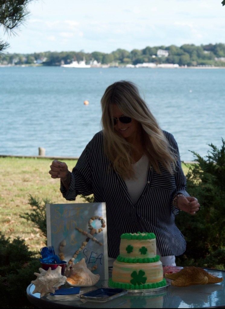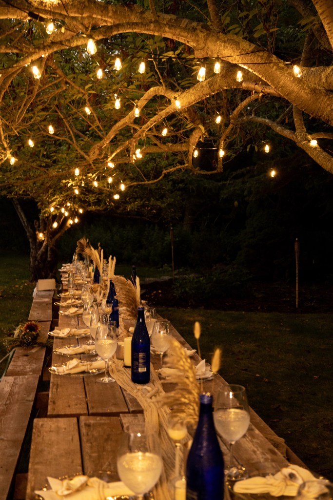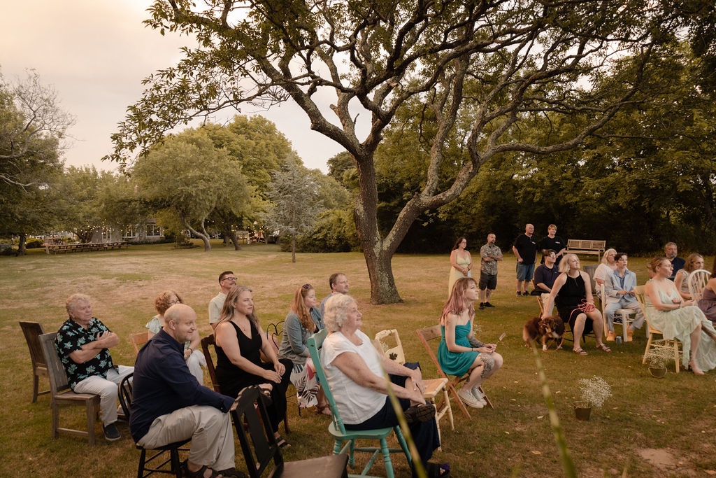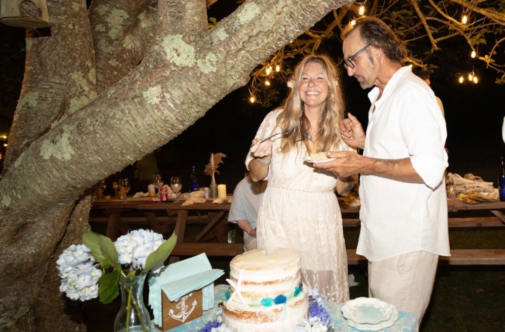 We picked a date. We changed the date. We asked the groom’s brother in law to please get ordained and officiate. We asked the groom’s sister to bake the cake. We asked them both to allow us to hold the reception in their backyard. There was driftwood dragged off the beach to create a wedding archway that was assembled and erected at the spot overlooking the water. The spot which neighbored the reception property. The spot which may technically be a public park. The spot which we may or may not have had a permit to use. Mismatched thrift store chair finds with some former funeral home chairs sprinkled in, created the intimate guest seating. I didn’t so much walk down the aisle, as frolic over to the spot after announcing in a loud voice to all gathered in the adjoining backyard to “follow me, I’m going to get married”. My oldest NoFo friend by my side. The groom’s son by his. As luck would have it, Mister Softee came by just in time to provide the processional music. The newly ordained officiant knocked it out of the park, especially when beginning the ceremony by quoting Prince. š The sunset sky was brilliant with a momentary threat in the form of a rumble of thunder and flash of light across the sky. Just the perfect amount of drama.