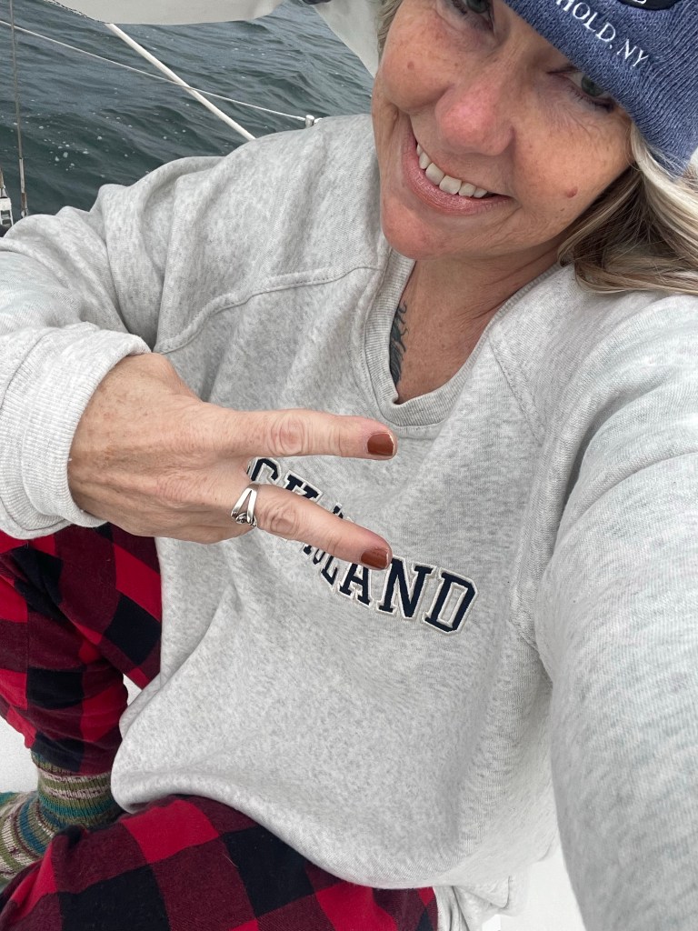 We radioed for help and the coast guard arrived in ten minutes, keeping eyes on us and remaining in regular contact until SeaTow’s arrival. Apparently they can only intervene if the boat is sinking or if we were injured. Josh did routine bilge checks to make certain our vessel wasn’t taking on water and Mariah was holding strong. As previously mentioned, the Harbor Master drove to the beach where our dingy had arrived. After securing the dingy she remained and kept eyes on us as well. I held myself upright as best I could in the cockpit, the boat heeled on its left side. Josh and I chatted and kept our spirits up as we were pummeled by the waves crashing over us. Man is this Hellie Hansen gear a great birthday gift!