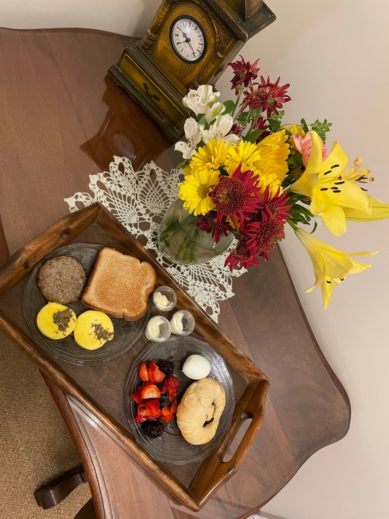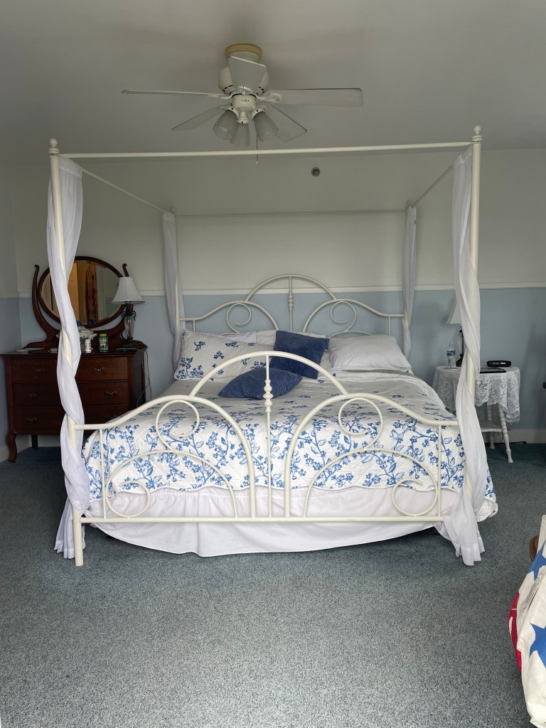 The essentials I brought ashore as we temporarily abandoned ship served us well today. There was no need to move beyond our beautiful king suite too early as I used the electric kettle to boil the water and the French press to make us perfect cups of coffee in our current favorite mugs. I can only give thanks that nothing as tragic as the bag containing these items being lost at sea happened in our perilous quest to make land. I shudder at the thought.