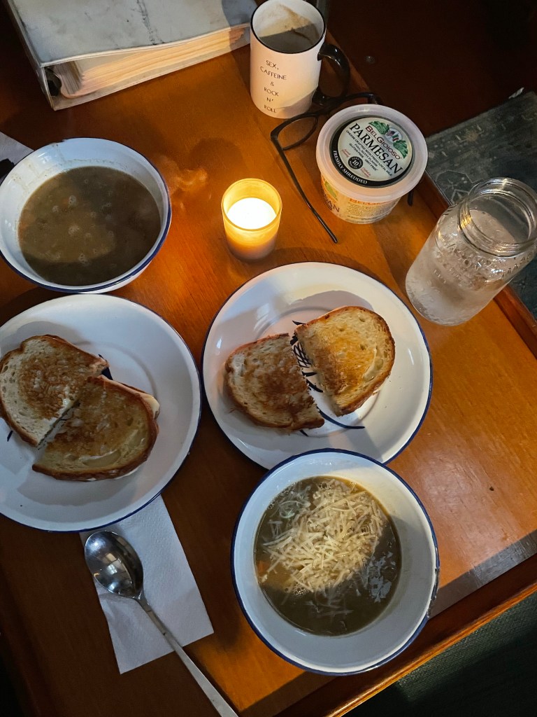 My Birthday morning began with a visit from the very understanding Harbor Master, she did not give us a hard time for being on a private yacht club mooring once we explained the situation. The captain put on his diesel mechanic hat and got to work. I spent the day in pajamas and busied myself with leisure activities, occasionally offering supportive words. By late afternoon filters were changed, air was bled, and she fired right up sounding strong. Our dinner reservations were a thing of the past and Montauk was off the table. We decided to stay put rather than sail for home as the weather has turned quicker than originally called for. The winds are already starting to blow, the seas getting high. No doubt the SV Mariah can handle this, and no doubt the captain is capable. However with the recent engine issues and myself, an inexperienced first mate, this is the safest decision. Looking at the marine forecast it is feasible to say we won’t leave until this coming Wednesday. We did motor over to a proper town mooring and chose one that put us considerably closer to the dingy dock. We are now hunkered down for the weather. My birthday dinner of soup and grilled cheese was delicious.