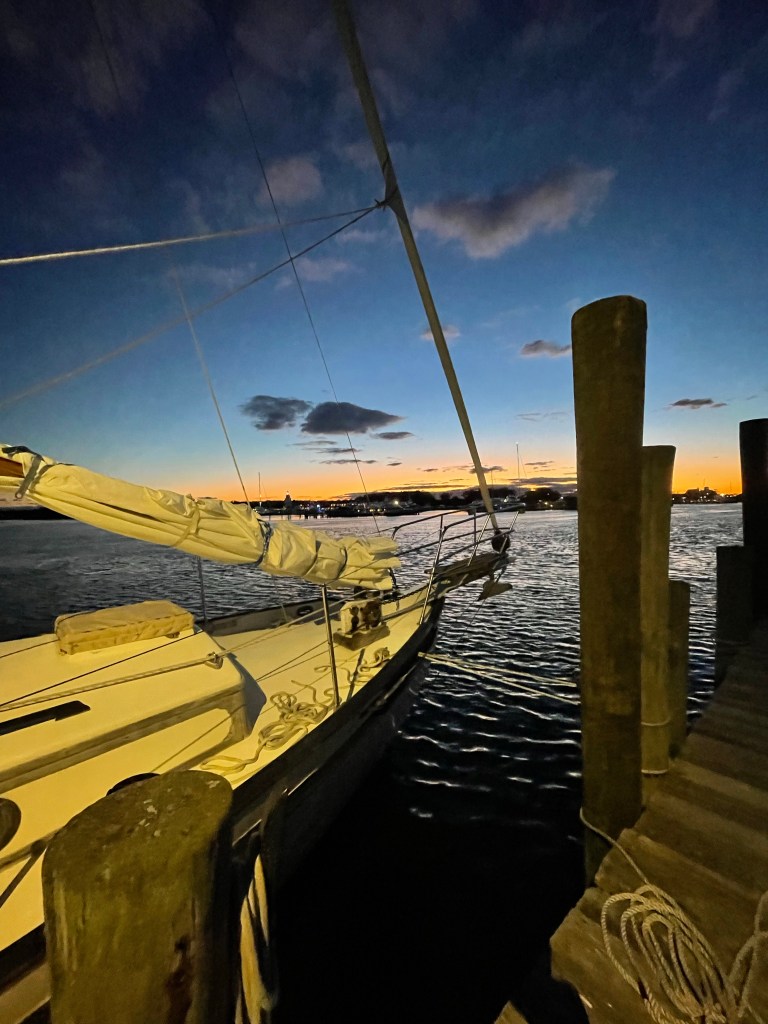 While I made the last leg of this trip on land (and two ferries), I still feel it’s my duty to continue this log until Mariah is safely back in her slip, the journey truly complete. The captain, along with his newest crew member (though they are not strangers to being on a sailboat in questionable conditions together and lawd, that’s a whole other story) made slow but steady progress on the uneventful sail home. Well almost uneventful that is. Let’s just leave it at that they were granted time to enjoy another one of our stunner NoFo sunsets while they waited for SeaTow – Boater friends – Do y’all have SeaTow? You’re crazy if you don’t. Huge props to SeaTow’s near and far for being the best!!