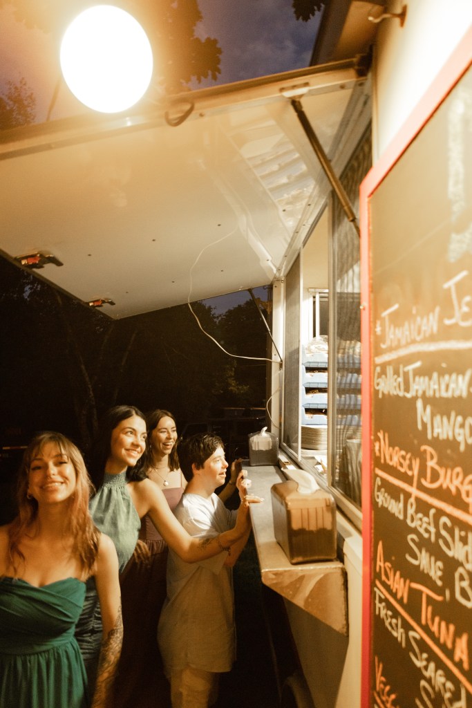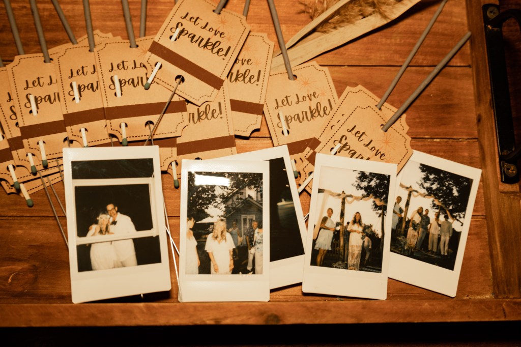 We ate gourmet sliders served up from a food truck owned and operated by dear old friends, sitting around swiped picnic tables from the marina lined up in a row, under lights strung through the trees. We drank sparkling water from blue bottles out of iridescent wine glasses. We were toasted, we laughed, we smiled, we took a gazillion Polaroid pictures with silly props, the groom broke out his guitar and serenaded me with an Elvis song. We cut and ate that gorgeous, delicious cake. My beautiful babies surrounded me with their attention and love from beginning to end on that day. There wasn’t a person who was a part of it that didn’t show up and help in all the ways.