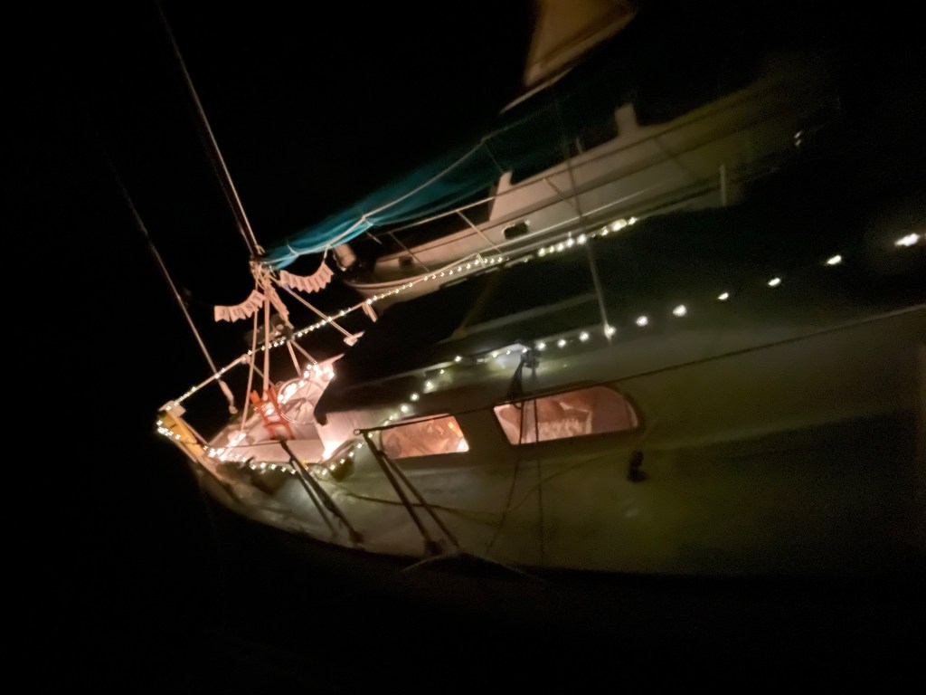 Sometimes luck meets skill and all is well. This would be one of those times. The wind, now on our stern, and the captain’s fine handling, had us sail on through keeping red on right with ease. I snagged us the first mooring we drifted upon and we safely secured ourselves. So yes, all is well. The engine concerns can wait until morning. Time to snuggle and snooze.