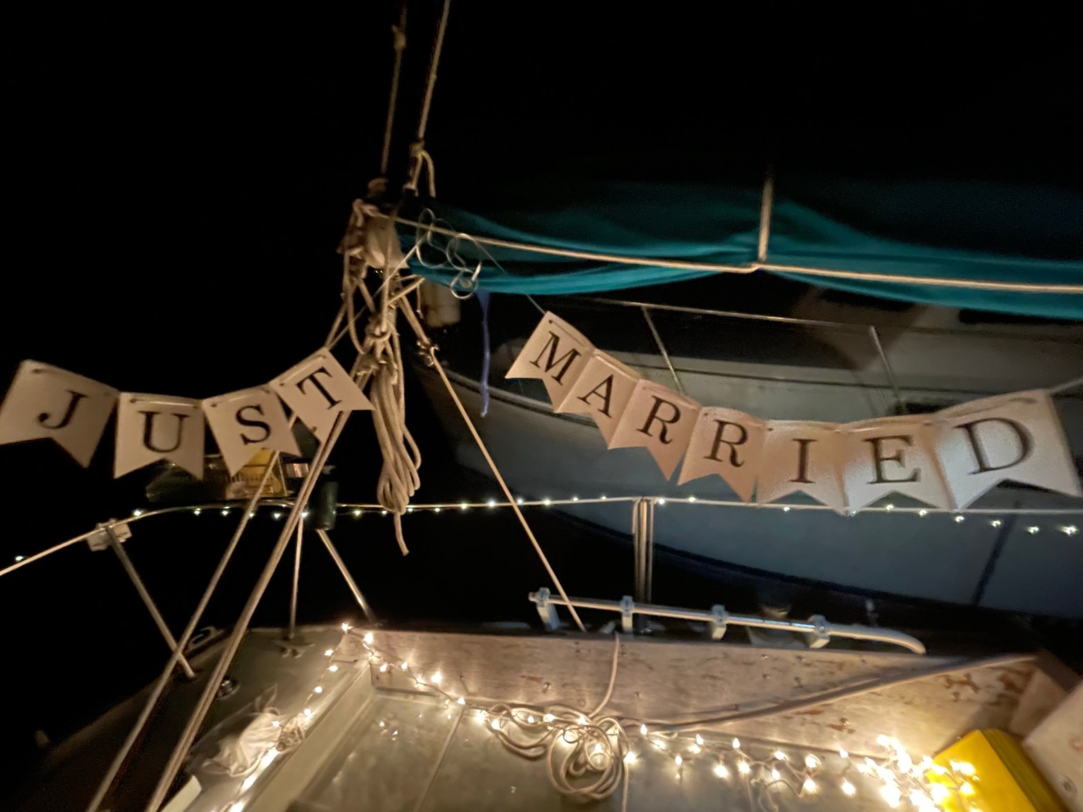 The finale of the night ~ Fireworks! Fireworks on the beach. Totally brilliant and illegally purchased by my youngest. She’s her mother’s daughter! And then, when it was all over, the groom and I retired to our boat. Our boat which had been delightfully decorated by a crew of incredibly thoughtful, loving, sneaky ones.
